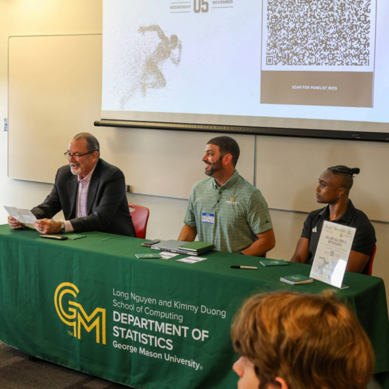 The event, hosted by the Department of Statistics in collaboration with the School of Sport, Recreation, and Tourism Management; George Mason University Athletics; the George Mason University student chapter of the American Statistical Association; and the Sport Management Society featured two panels and a networking session designed to connect students with alumni working in sports analytics and those currently helping George Mason athletes thrive.